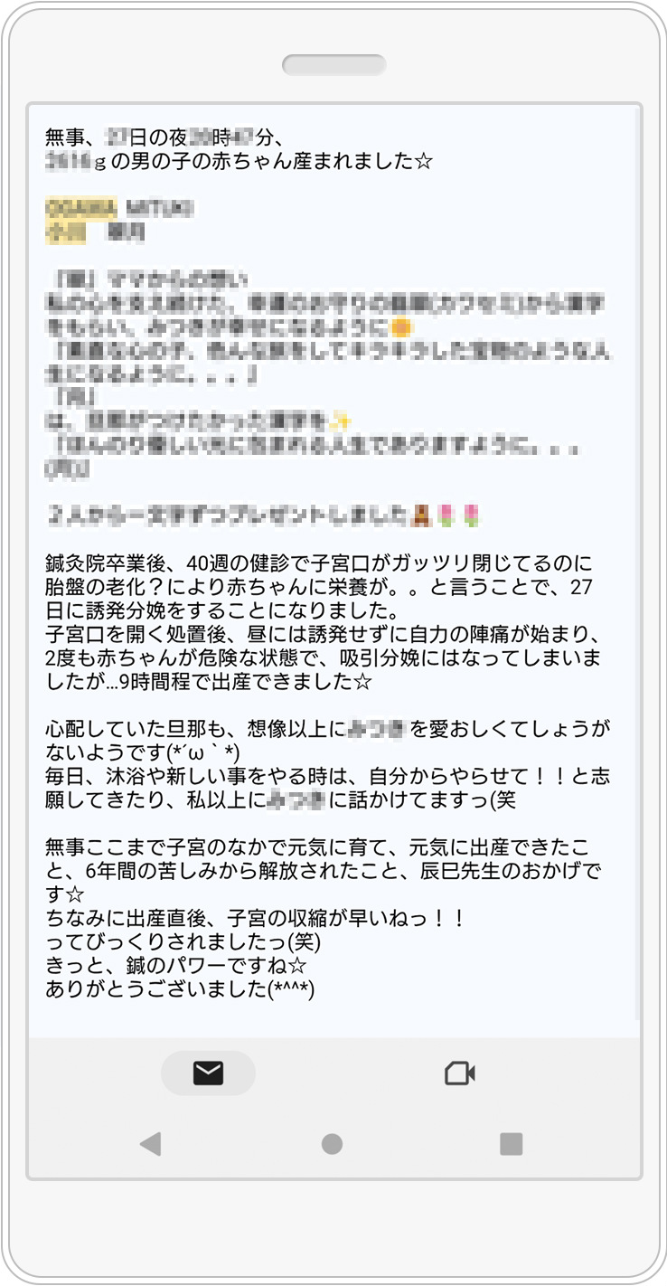無事ここまで子宮のなかで元気に育て、元気に出産できたこと、6年間の苦しみから解放されたこと、辰巳先生のおかげです☆